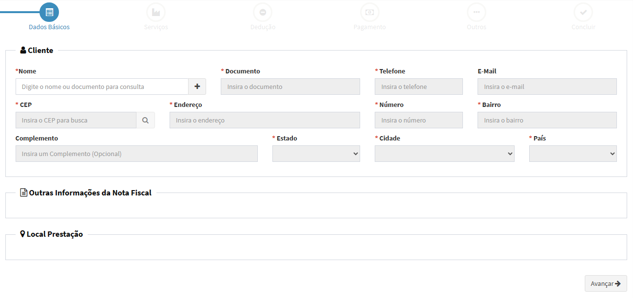 Após preencher todos os dados necessários, clique em Avançar é direcionado para a etapa seguinte de Serviços.