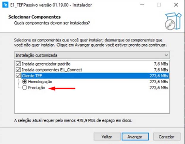 Instala gerenciador padrãoeCliente TEF, aqui é possível escolherHomologaçãoouProdução.No caso de querer usar o