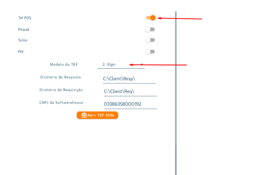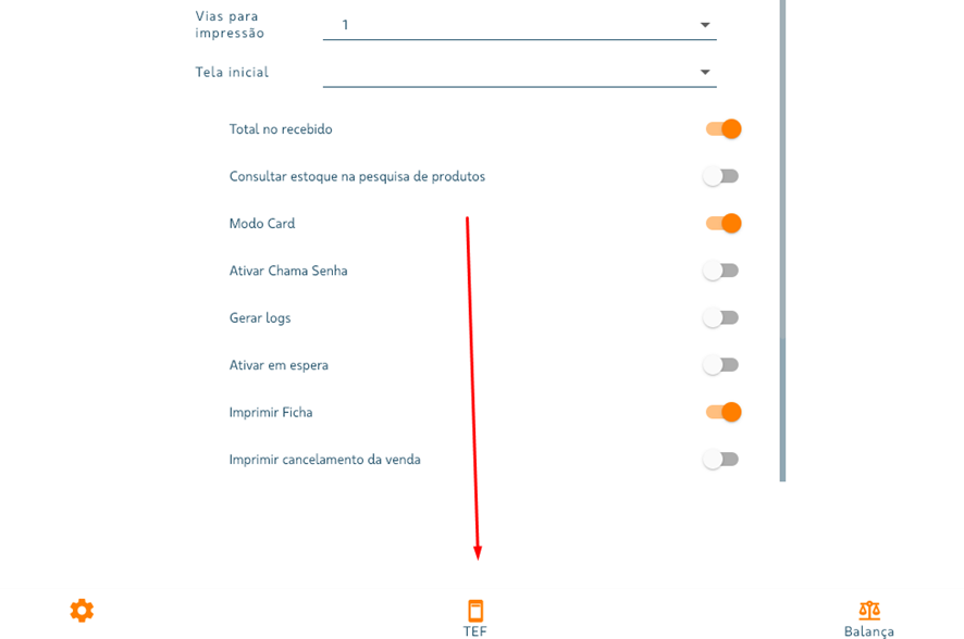 Concluir a instalação. NO PDV1. Vá em Menu > PDV.2. Opção de TEF.3. Ativar TEF POS ; selecionar modelo de TEF: ELGIN.